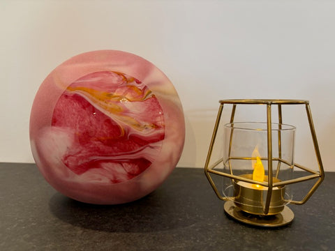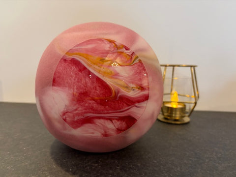 De Elan-line is geïnspireerd op de 4 elementen uit de natuur: aarde, water, lucht en vuur. De 4 elementen vertalen de hartstocht “het vuur” van de krachten in de natuur. De Elan-line vertegenwoordigd een collectie as-gedenkornamenten met voornamelijk ronde vormen en zijn verkrijgbaar in diverse kleurcombinaties. De Elan-line is een unieke collectie urnen die met bezieling is vervaardigd. Uniek in onze collectie is deze 4 liter urn. De bolvormige urn heeft een basiskleur van parelmoer-rood met een patroon van wit en blauw-groen-paars tinten, afgewerkt met een fijn reliëf. Aan de binnenzijde van de urn bevindt zich een as-reservoir waar al het crematie-as in bewaard kan worden. Deze urn wordt afgesloten d.m.v. een zelf-hechtende sluitplaat. De urn is niet transparant dus het crematie-as is niet zichtbaar. De Elan-line 4 liter urn is ook verkrijgbaar in de kleuren; blauw, ivoor, nova, terra en flower field. Deze prachtige urn is meer dan een as-gedenkornament. Het is een waar kunstwerk ter herinnering aan uw dierbare. Tevens is de Elan-line ook zeer geschikt als grafornament. Alle 4 liter urnen zijn van glas en met de hand vervaardigd. Dit maakt elk ornament uniek.