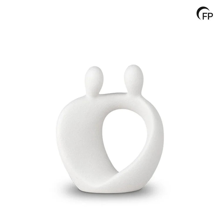 Deze witte porseleinen mini urn staat symbool voor verbondenheid. Het verfijnde ontwerp toont twee mensen die elkaar omarmen, als metafoor voor de blijvende band die liefde en herinnering overstijgt. De zachte lijnen en rustige uitstraling zorgen ervoor dat deze urn past in ieder interieur. Dit model is naast wit ook verkrijgbaar in het grijs.