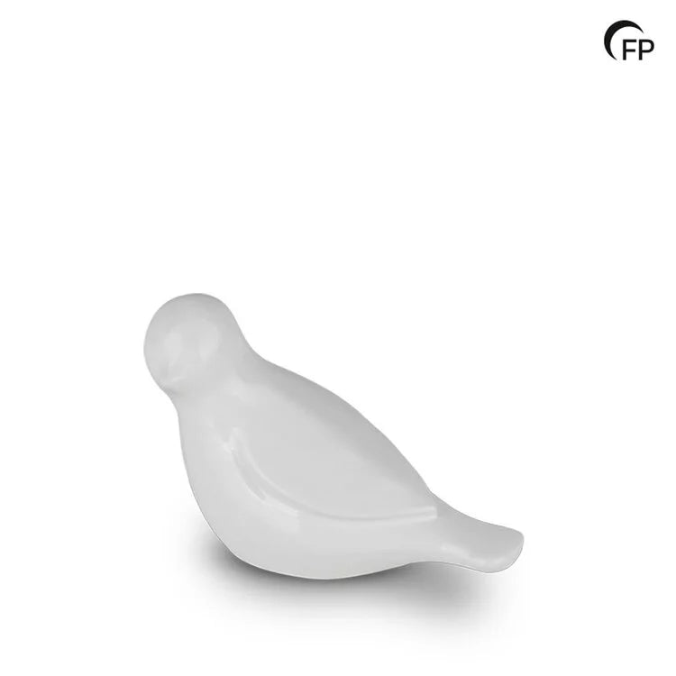 Deze keramische keepsake urn in de vorm van een vogeltje, voorzien van een witte coating, straalt eenvoud en rust uit. Door zijn ingetogen ontwerp vormt het een subtiele en tastbare herinnering die past in vrijwel ieder interieur, zonder nadrukkelijk aanwezig te zijn. Naast de witte uitvoering is dit vogeltje ook verkrijgbaar in turquoise en een zilverkleurige variant.