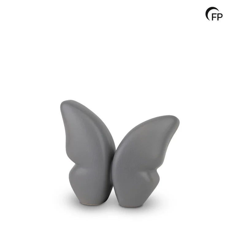 Deze keramische kleine urn in de vorm van een vlinder heeft een elegante matte grijze afwerking die rust en sereniteit uitstraalt. Het ontwerp staat symbool voor de vrijheid van de ziel en de dierbare herinneringen. De urn is daarnaast beschikbaar in twee grotere formaten, een keepsake variant en in de kleuren zwart en wit.