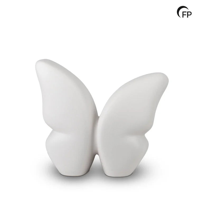 Deze keramische urn, ontworpen als vlinder, heeft een verfijnde matte witte afwerking die een gevoel van rust en sereniteit geeft. Het ontwerp symboliseert de vrijheid van de ziel en de blijvende dierbare herinneringen. De urn is bovendien verkrijgbaar in één groter formaat, twee kleinere formaten, en in de kleuren zwart en grijs.